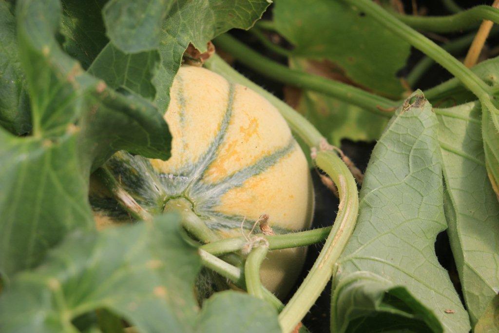 Que ce soit par temps de canicule ou de pluie, le melon sait jouer à cache-cache et se protéger, sous les larges feuilles, des rayons de soleil brûlants ou des gouttes de pluie trop fortes.