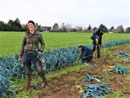 C’est la fin de saison de l’arrachage des poireaux d’hiver, plantés il y a 9 mois environ, en Juillet. Et notre équipe y met du cœur, Laura en particulier. Par ces temps pluvieux , tout se fait manuellement