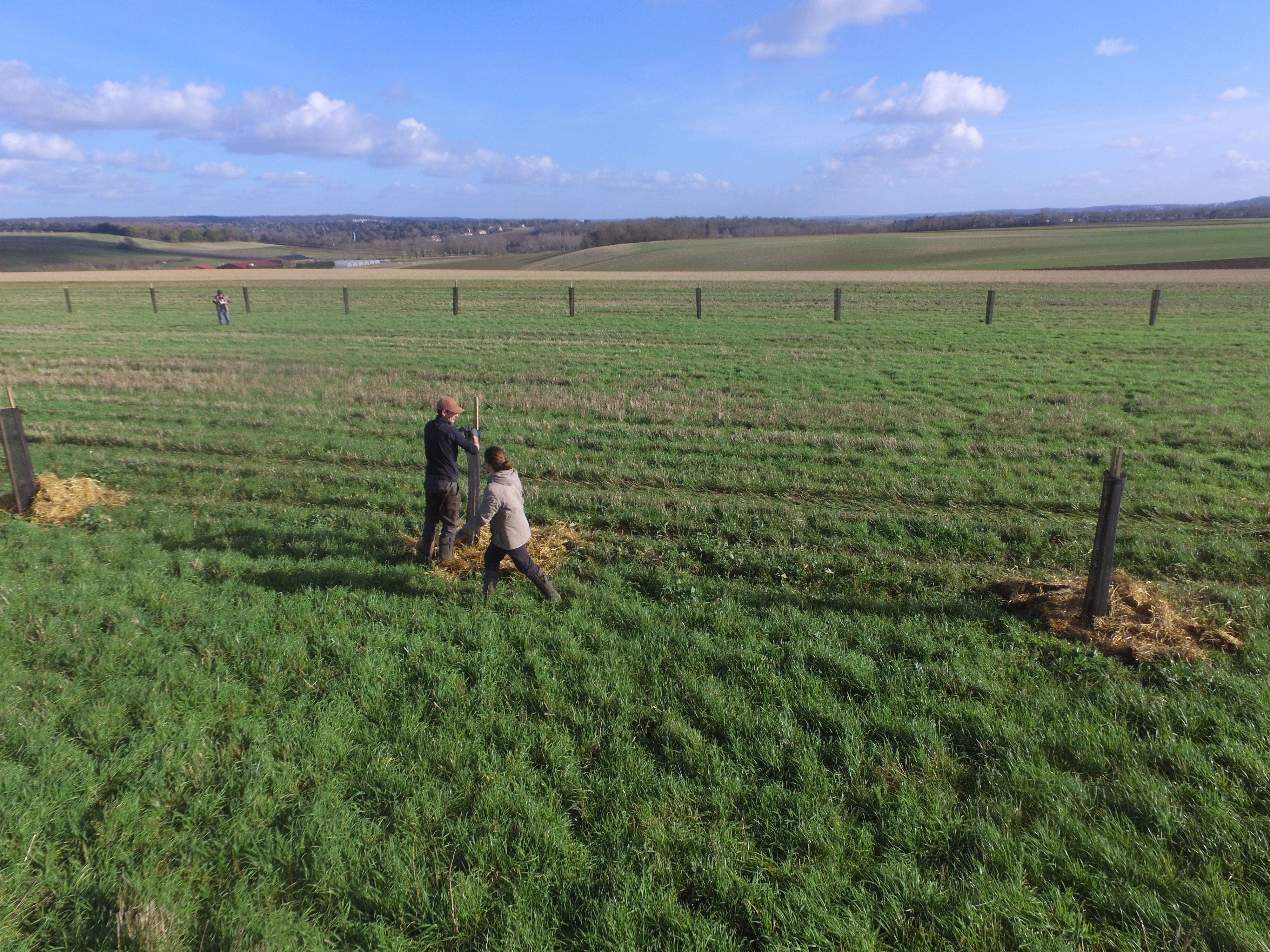 Avec bien sûr au pied de chacun un paillage biodégradable et une protection chevreuil ou lièvre, et pour aider l’arbre à bien s’installer et à bien s’enraciner, malgré les vents, un tuteur.