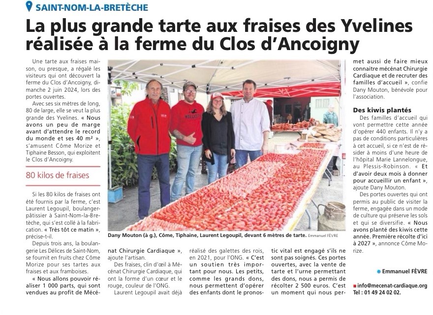Suite au très grand succès de notre journée « porte ouverte », qui va permettre d’opérer du coeur des enfants dont le prosnostic vital est engagé, grâce à la bienveillance de Mécénat Chirurgie Cardiaque et de Laurent Legoupil ( les délices de Saint Nom). Nous avons décidé, pour ceux, déçus de ne pas avoir eu de tarte aux fraises, de produire une tarte aux framboises, toujours au profit de Mécénat Chirurgie Cardiaque, Samedi 8 Juin 2024 à la Ferme du clos d’Ancoigny de 9 h 00 à 12h00
